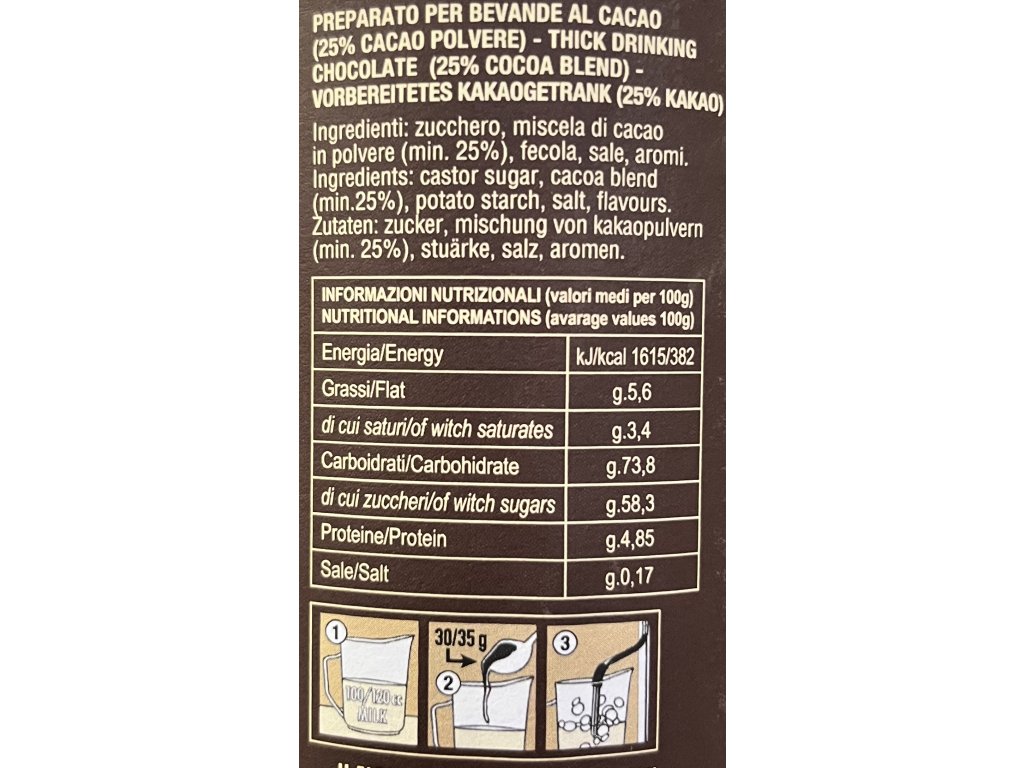 Vysoko kvalitná talianska horúca čokoláda v sáčku 30g. Ochutnajte mliečnu horúcu čokoládu, ktorú si môžete pripraviť podľa vlastnej chuti buď s horúcim mliekom alebo vodou.