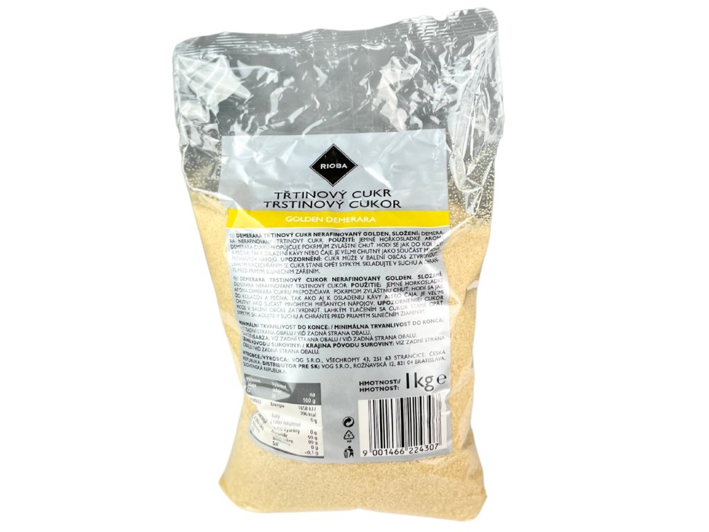 Rioba Demerara Golden - prírodný trstinový cukor nerafinovaný svetlý. Svetlý kryštalický cukor, príjemnej medovej vône a sladko trstinovej chuti z Kolumbie.